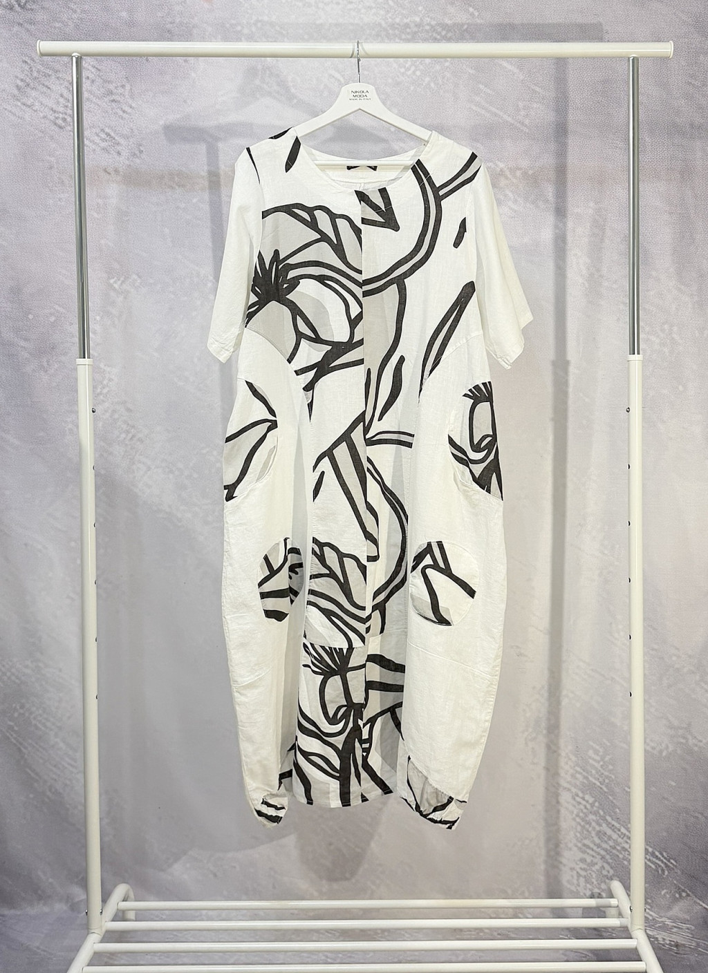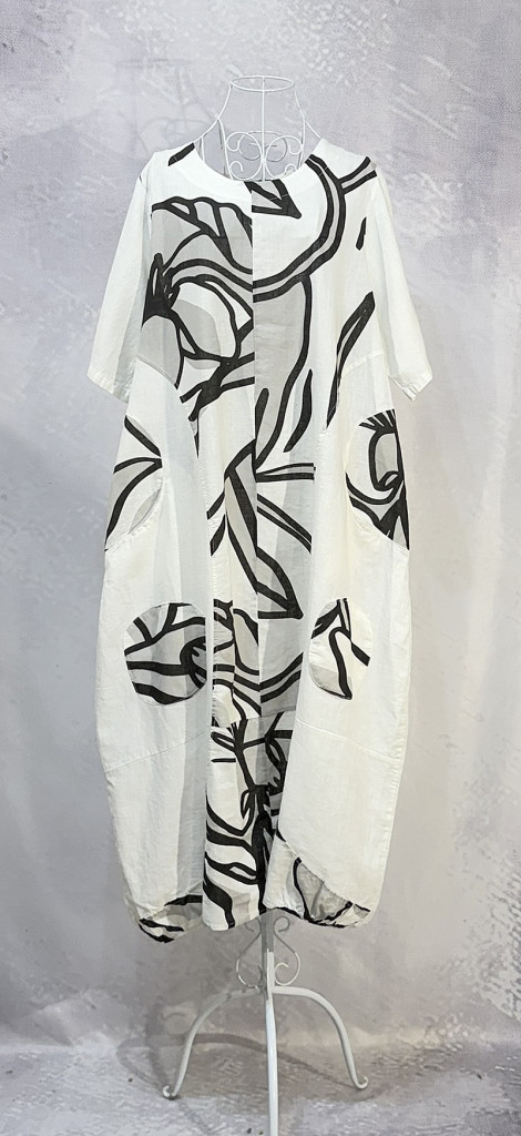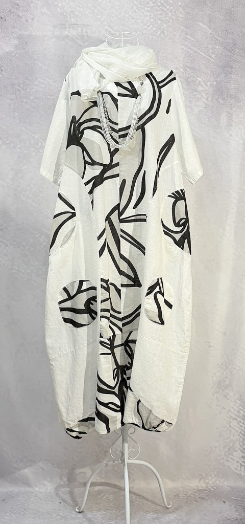 Az egyedi, fekete absztrakt minta modern, művészi megjelenést kölcsönöz, míg a bő, lezser szabás maximális komfortot biztosít. A praktikus zsebek és a letisztult fazon még hordhatóbbá teszik a mindennapokban.
