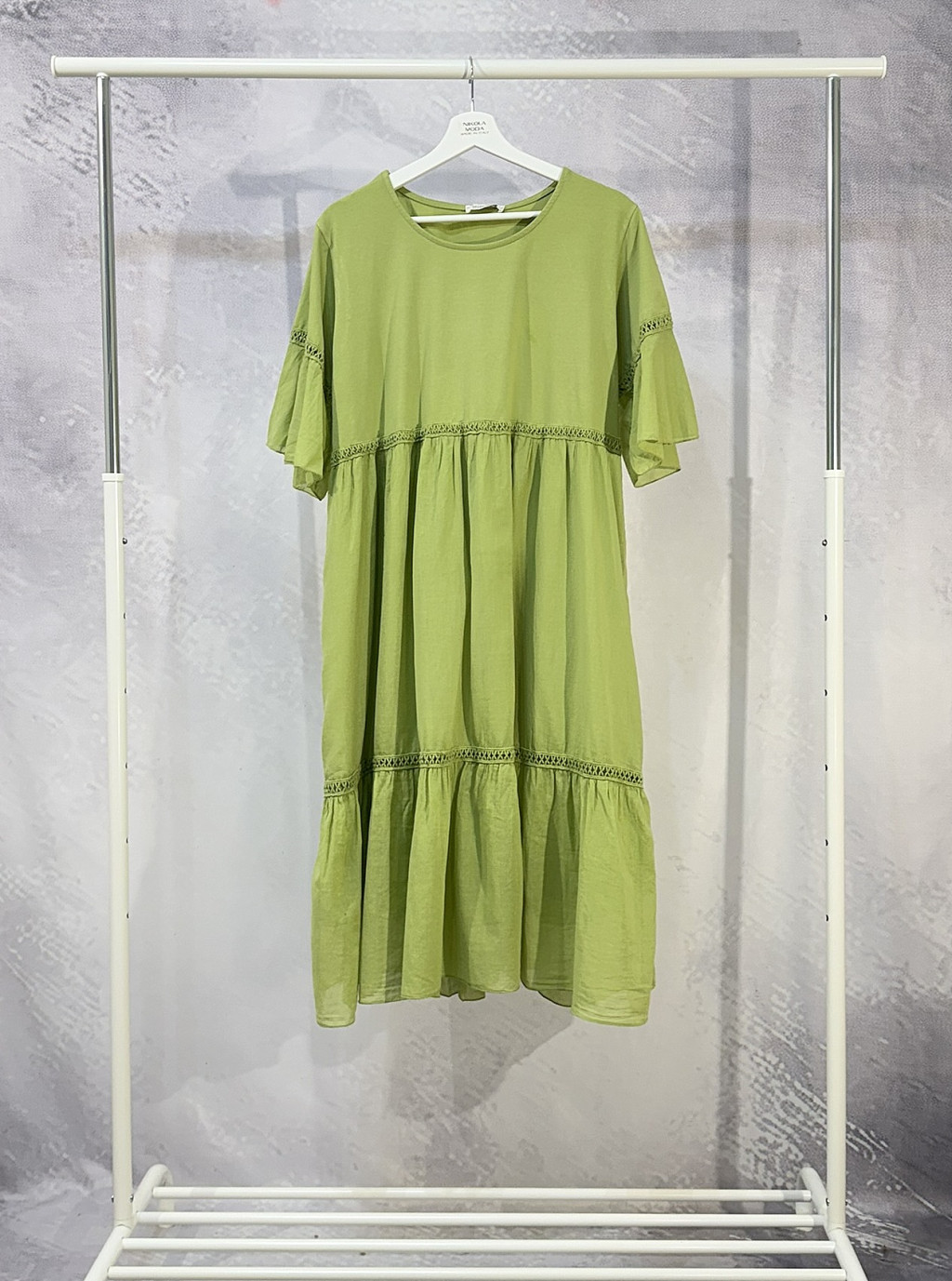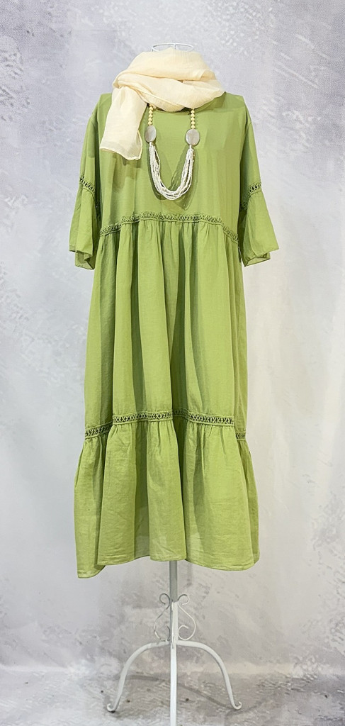 Könnyed, nőies fazonú ruha, amely tökéletes választás a melegebb napokra. A lágy esésű anyag üde, természetes megjelenést kölcsönöz, míg a fodros ujjak és a finom csipkebetétek romantikus hangulatot adnak a darabnak. Bő szabásának köszönhetően kényelmes viselet egész nap, légies kialakítása pedig elegánsan követi a mozgást. Szandállal vagy sportcipővel is könnyed, stílusos nyári szettet alkothat vele.
