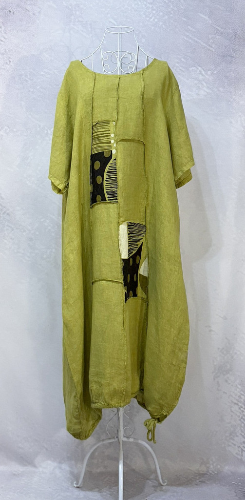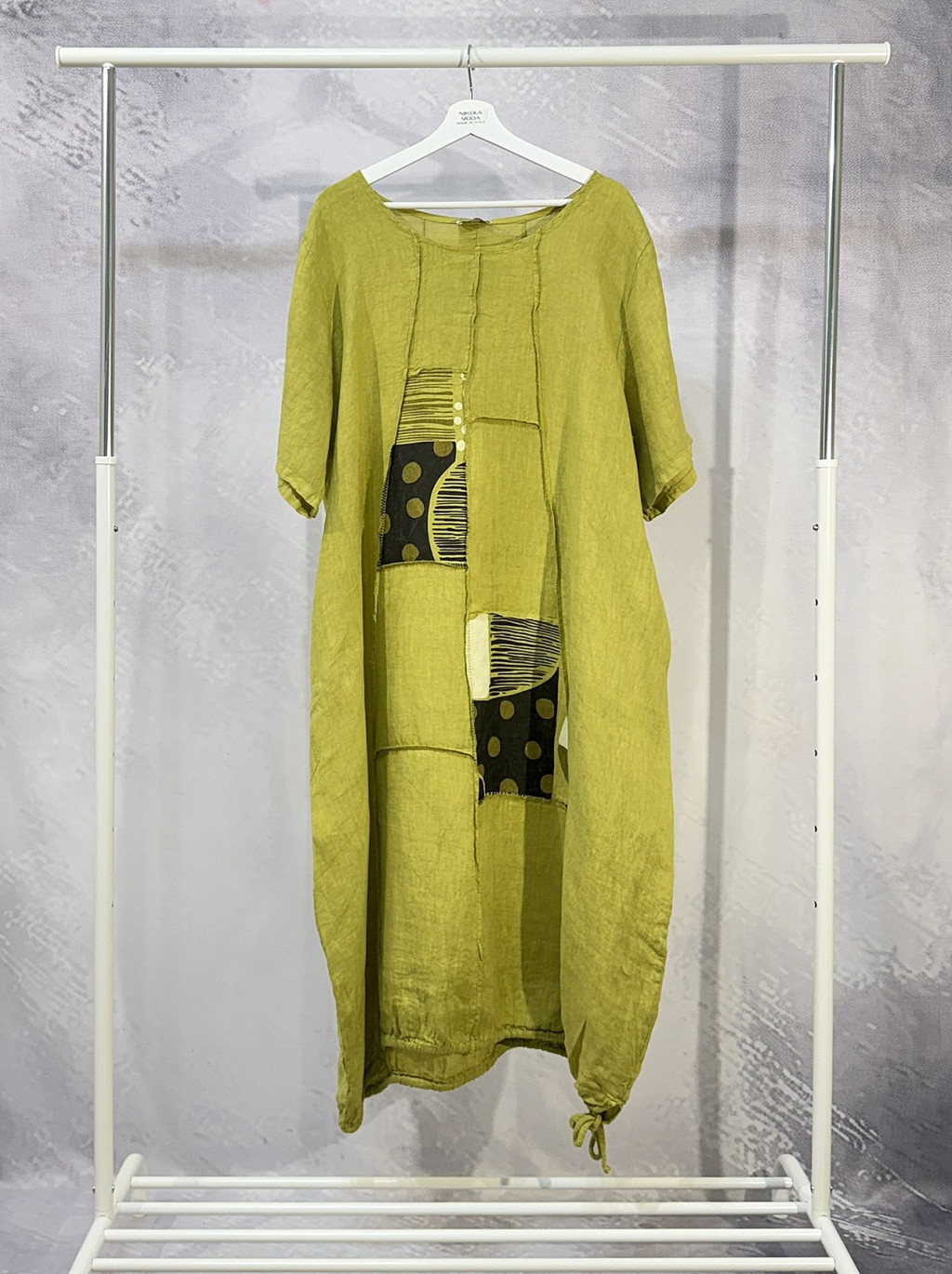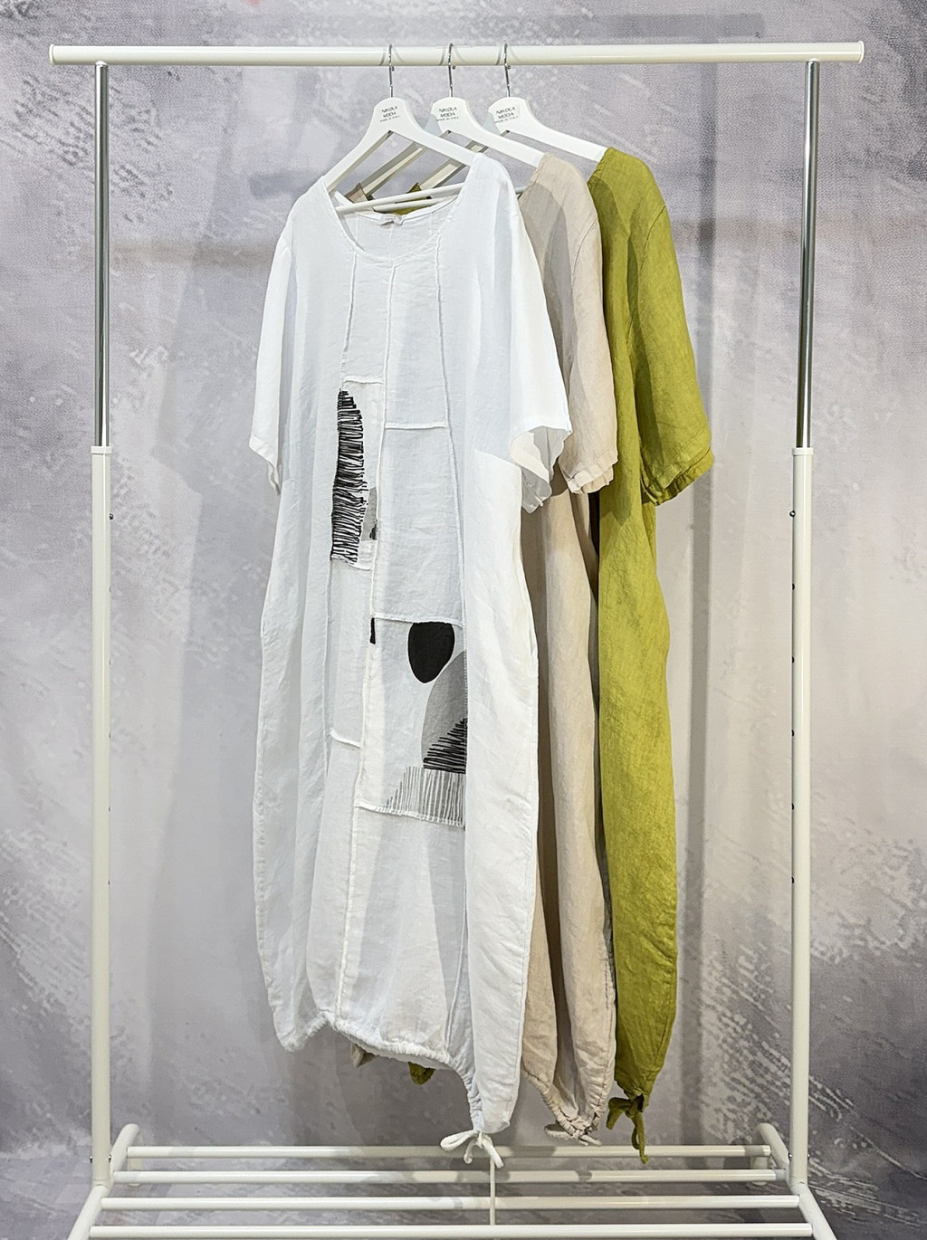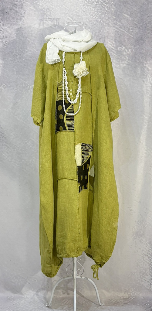 Over size, enyhe ballon fazonú, patchwork mintás bő len ruha, oldalsó zsebekkel. A laza fazon szabad mozgást biztosít, a finom részletek – mint az alsó szegély húzózsinórja és a dekoratív panelek – pedig egyedi megjelenést kölcsönöznek. Tökéletes választás városi sétákhoz, nyaraláshoz vagy akár egy stílusos, hétköznapi outfit részeként.
